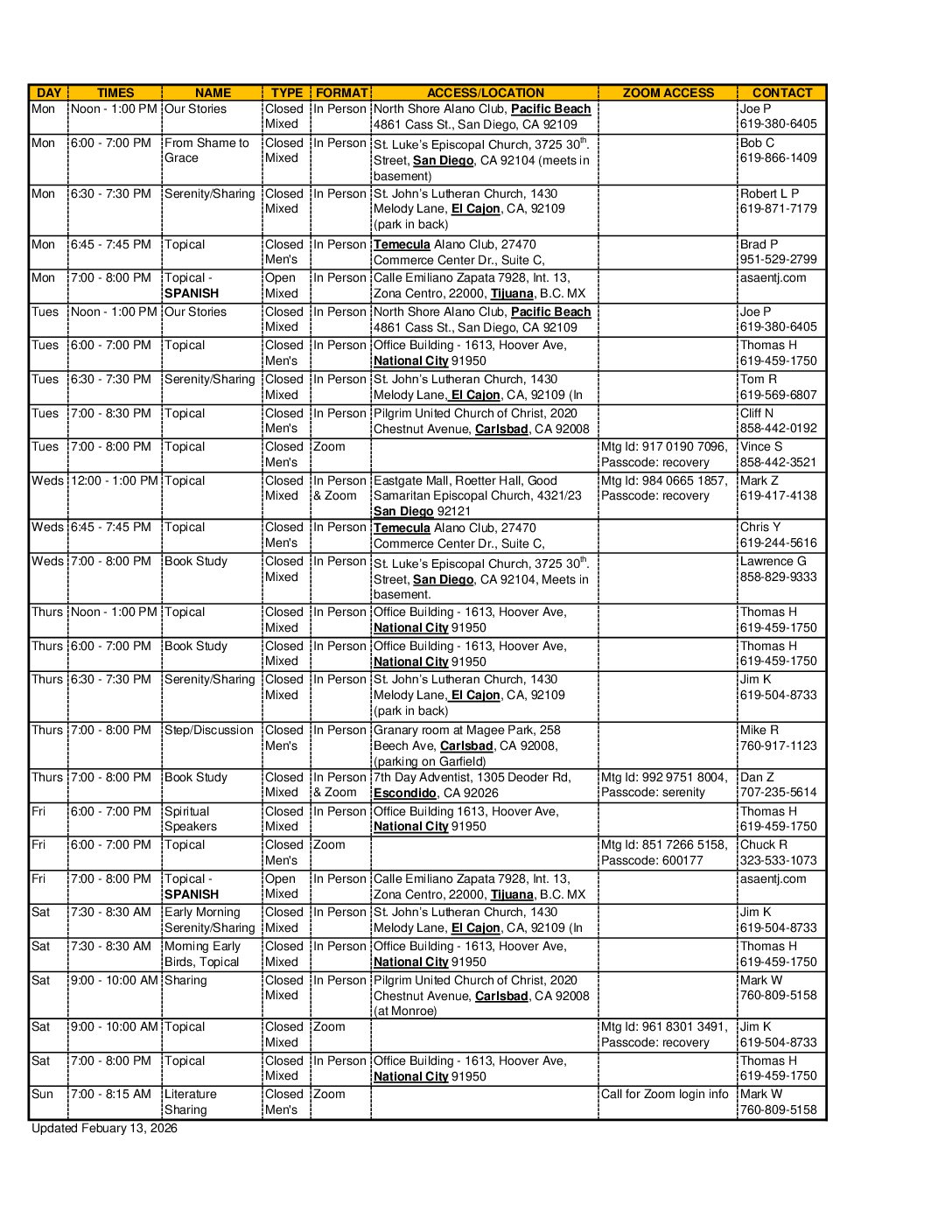 Please call meeting contact before attending first meeting to ensure meeting information is accurate. Email: meetings@sandiegosaa.com to update information on this list. This list was last updated February 13, 2026. Meetings are open only to those who have a desire to stop addictive sexual behavior.